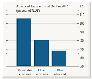 The graph below (source: International Monetary Fund) shows estimated European fiscal debt positions in 2015. Establishing public debt sustainability is a top priority for many European economies. The vulnerable euro area includes: Greece, Ireland, Italy, Portugal, and Spain. Table shows countries (as of year end 2009) with government debt ratios higher than 60% of GDP.